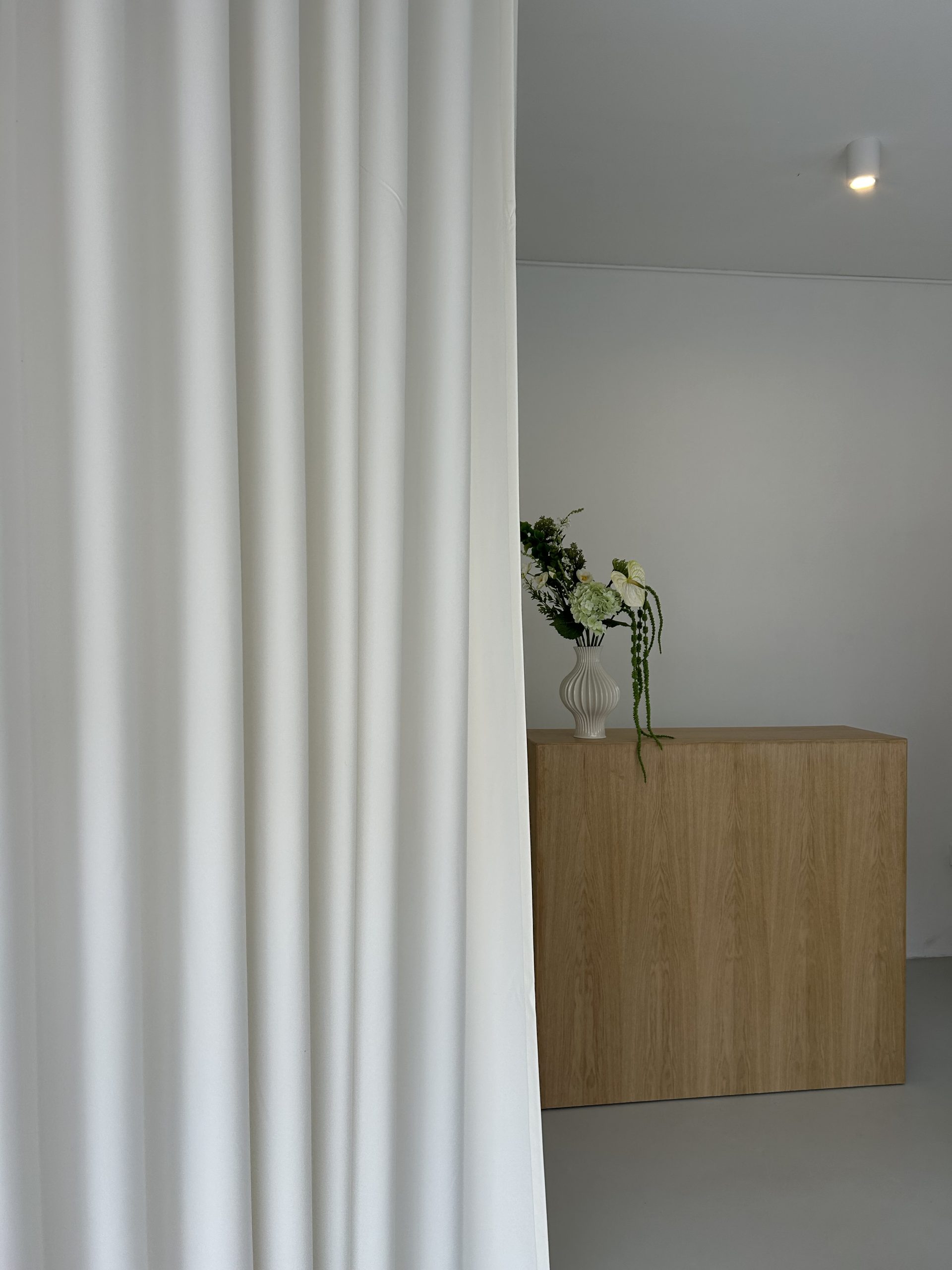 Gardinerne spiller en afgørende rolle i at forme rummet. De bidrager til at opdele studiet i zoner, skabe en følelse af afskærmning og samtidig bevare en lethed i udtrykket. Derudover gør de det muligt at kontrollere lysindfaldet, så stemningen kan tilpasses forskellige tidspunkter på dagen og typer af hold. Denne fleksibilitet er med til at sikre, at rummet fungerer optimalt – både funktionelt og æstetisk.